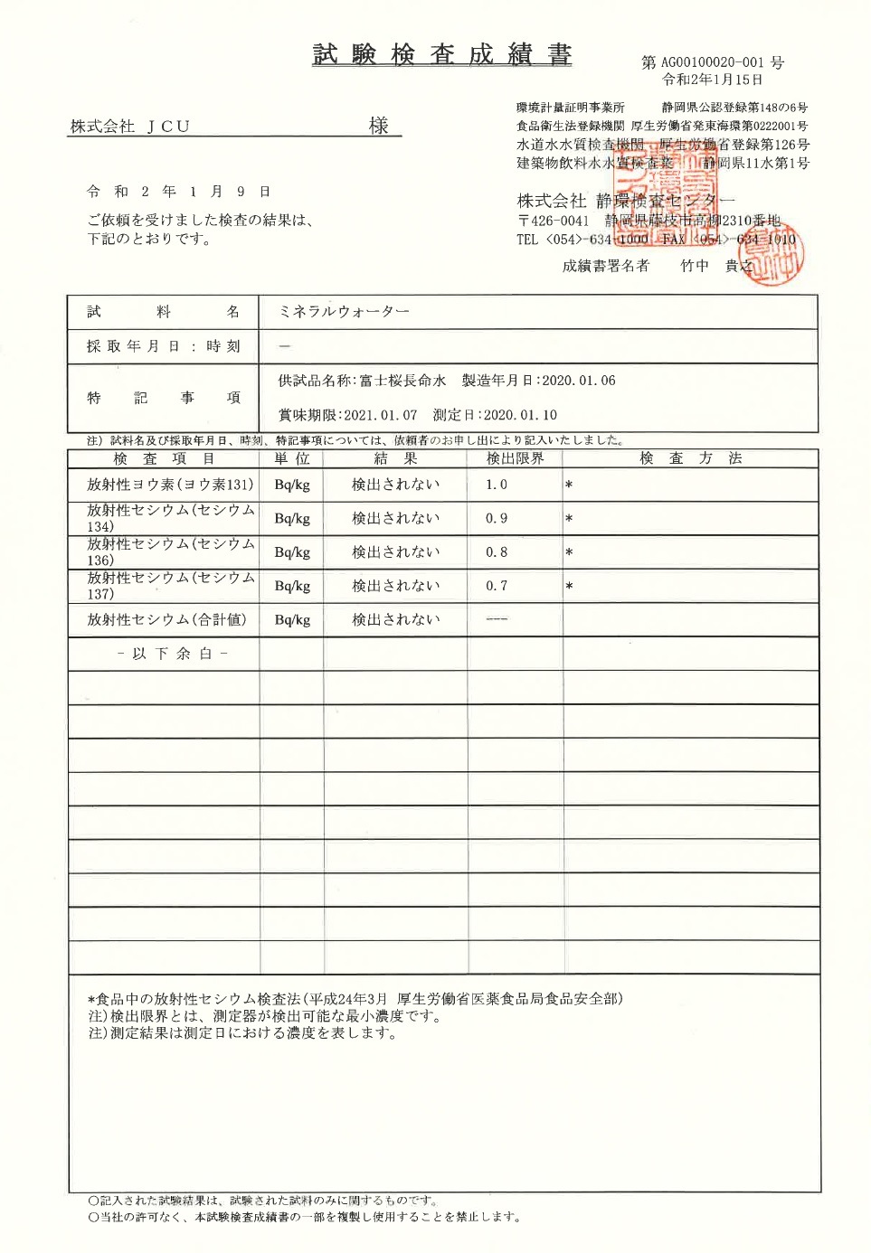 富士桜長命水より放射性物質は検出されませんでした(2020年1月)